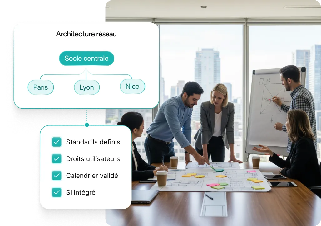 Méthodologie éprouvée sur 12 réseaux : paramétrage centralisé, formation par lots, bascule centre par centre sans interruption et centralisation des données. Votre chef de projet dédié orchestre tout le déploiement. Vous suivez l'avancement, nous gérons l'exécution.